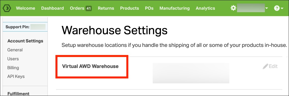 - A new warehouse labeled AWD Warehouse will appear under Settings → Warehouses.