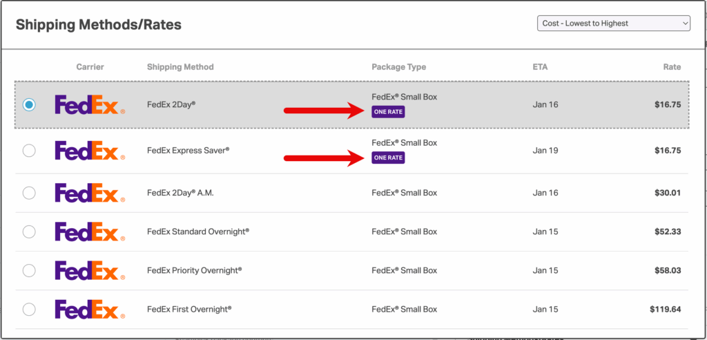 - Select a shipping method that displays the purple One Rate badge.
