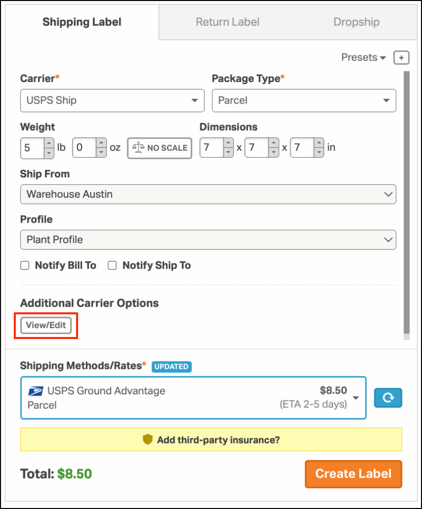 1. In the Shipping label panel, under Additional Carrier Options, select View/Edit.