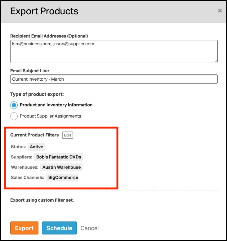 - In the export window, click Edit next to Current Product Filters.