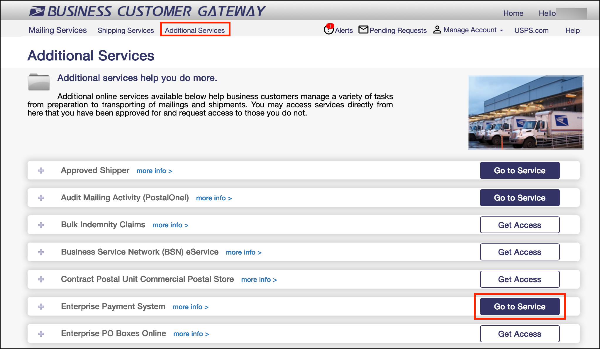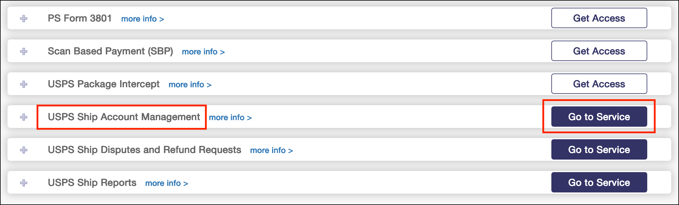 3. Find USPS Ship Account Management and select Go to Service.