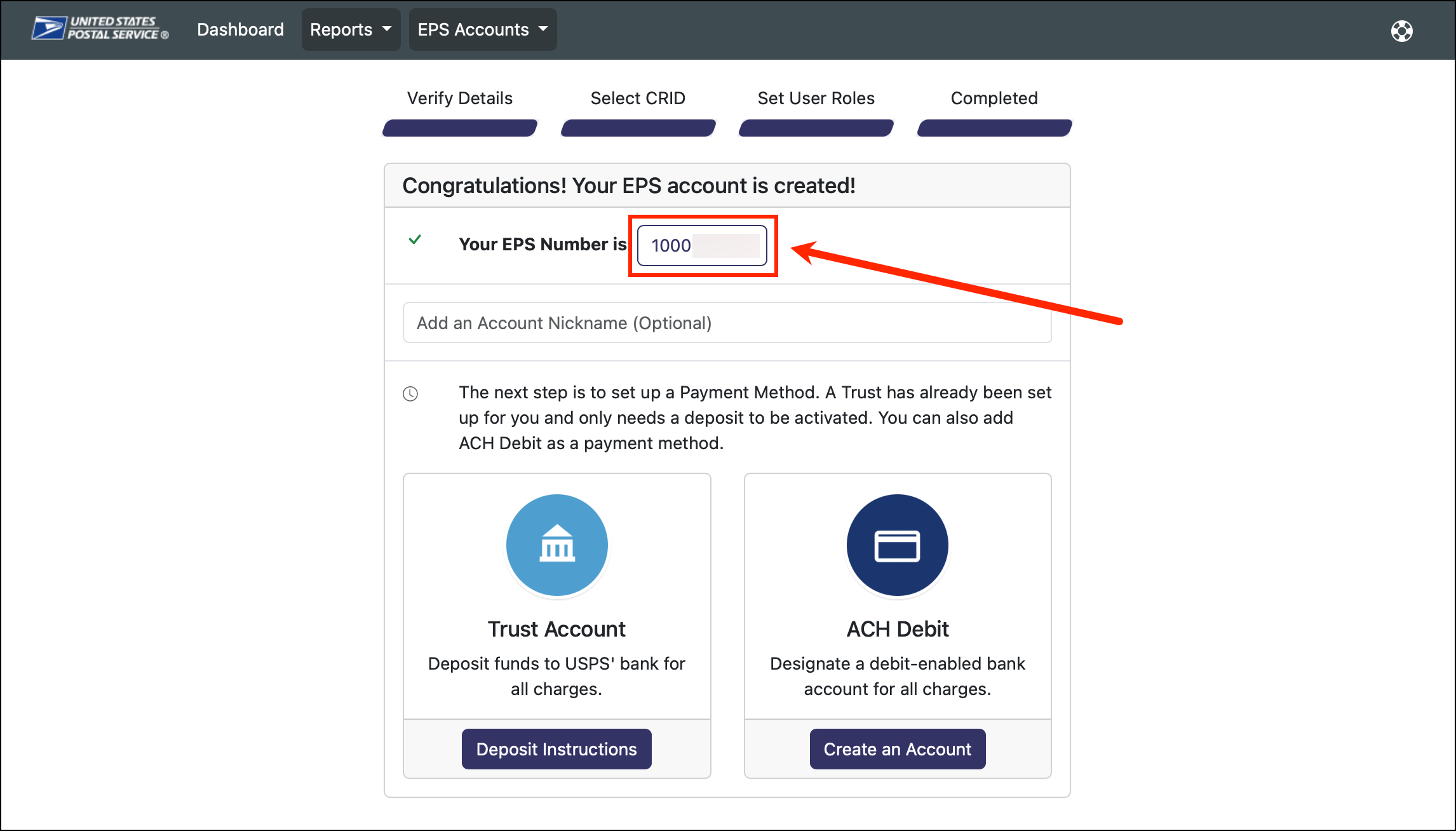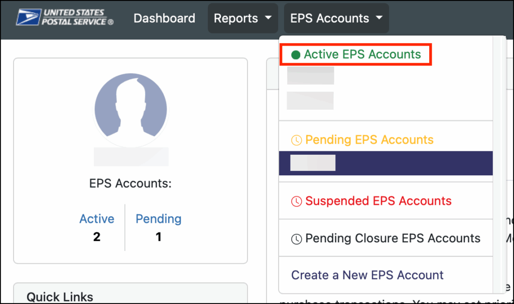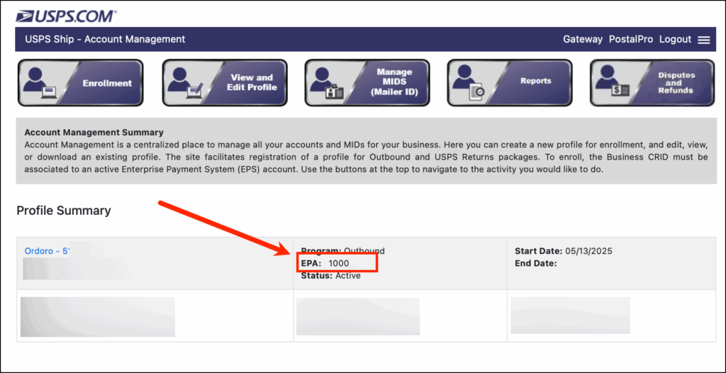 Note: If you were unable to save the EPA/EPS Account Number, please see this section below “How can I find my EPA/EPS Account Number on USPS?”.