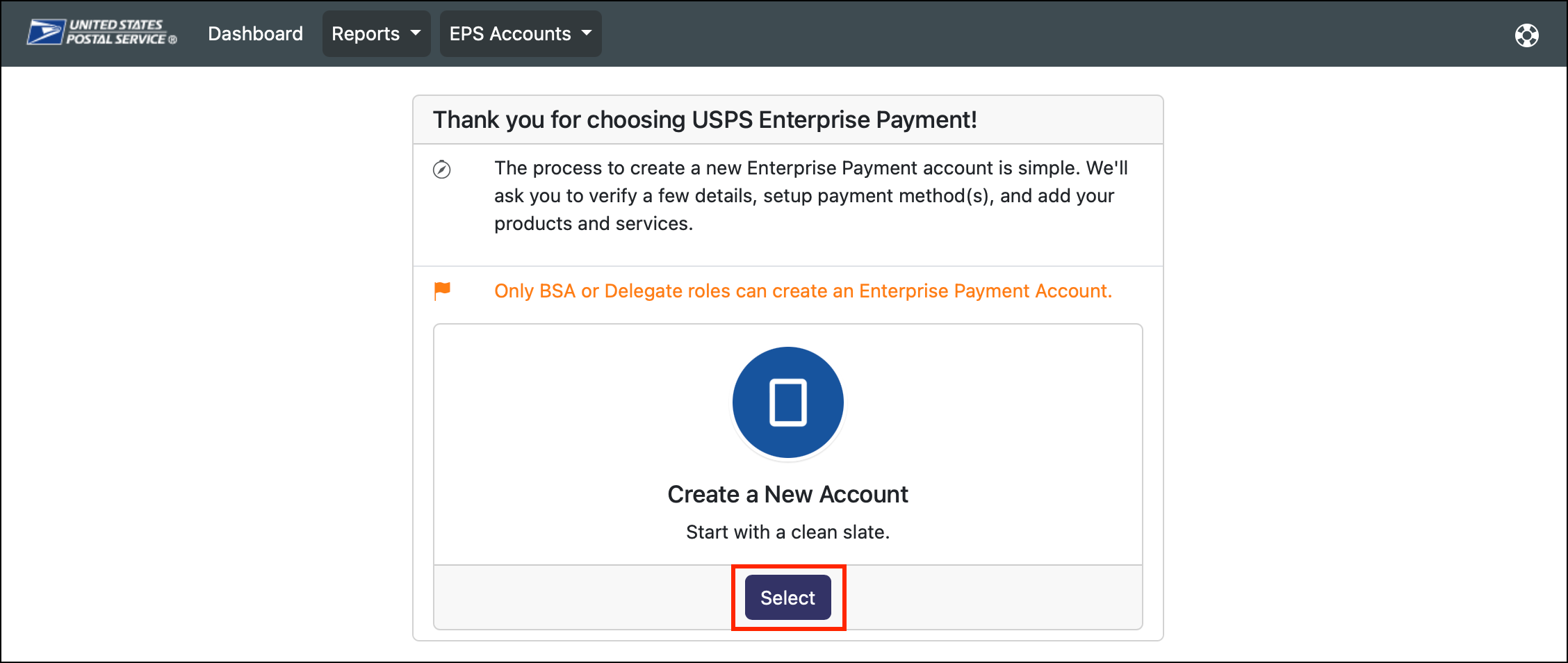 If you were not given EPA/EPS account number in your email from USPS, please follow these steps to add a payment method.