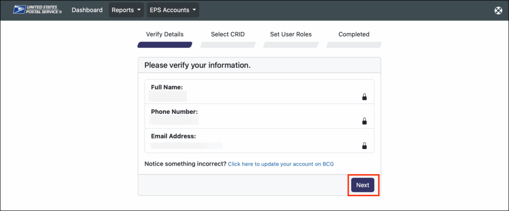7. Verify your information and then select Next.