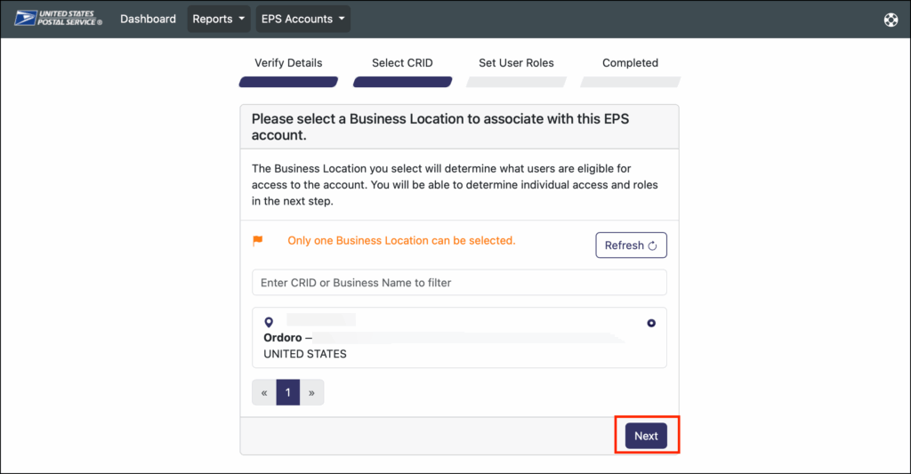 8. Select your business location and then select Next.