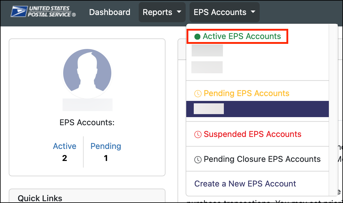 13. When you return to the EPS Accounts dropdown, your EPS number should be listed under Active EPS Accounts in green.