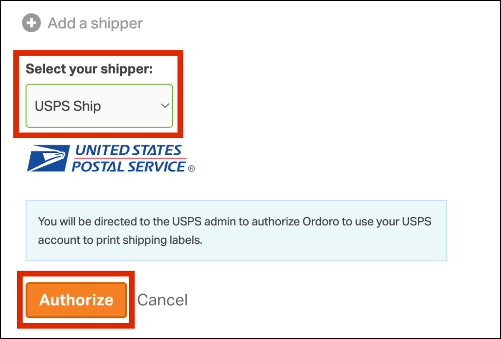 - Click Add a shipper and select USPS Ship from the dropdown.