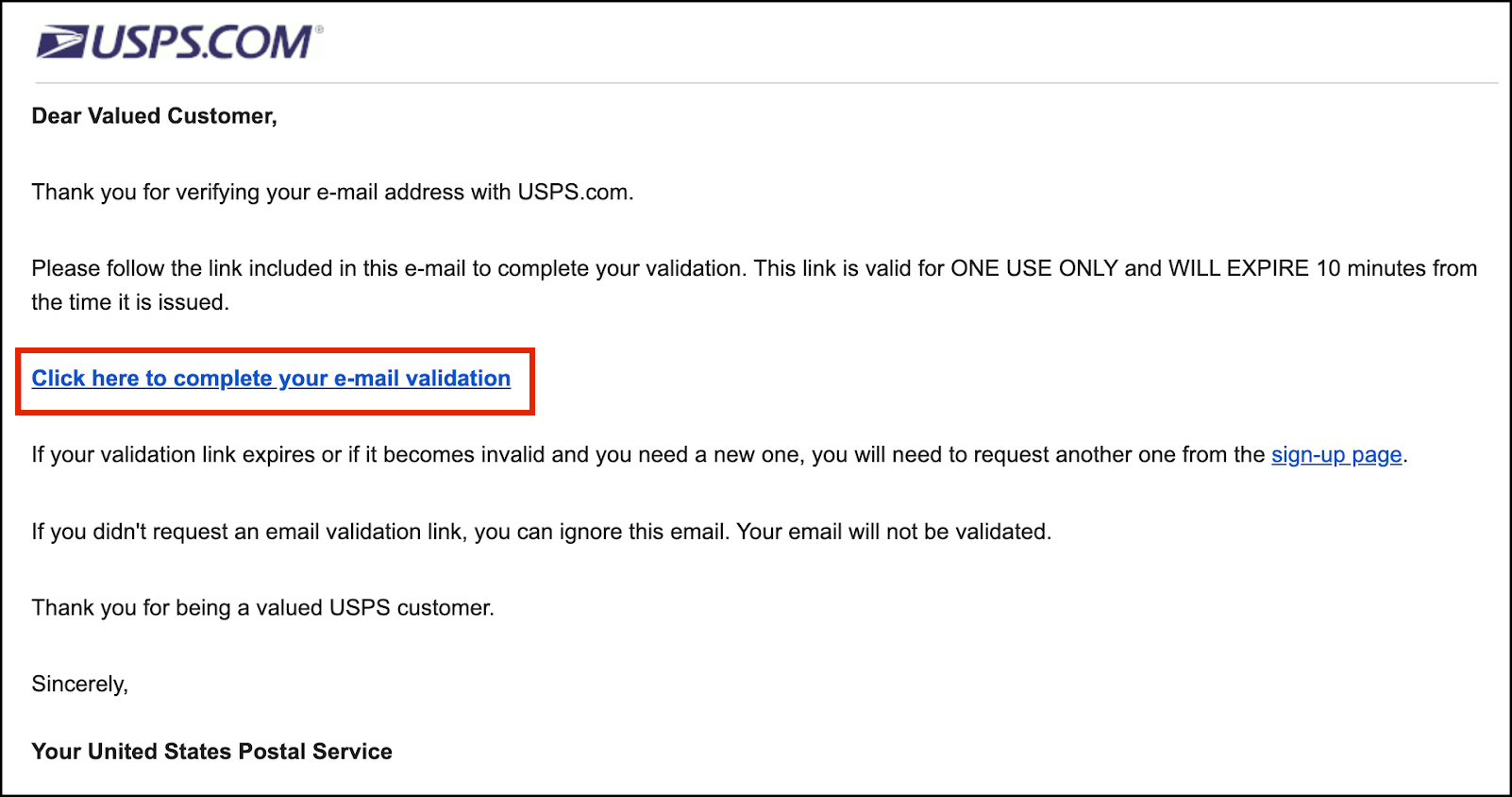 - Check your inbox for an email from USPS. In the email, select Click here to complete your e-mail validation. This link expires within 10 minutes.