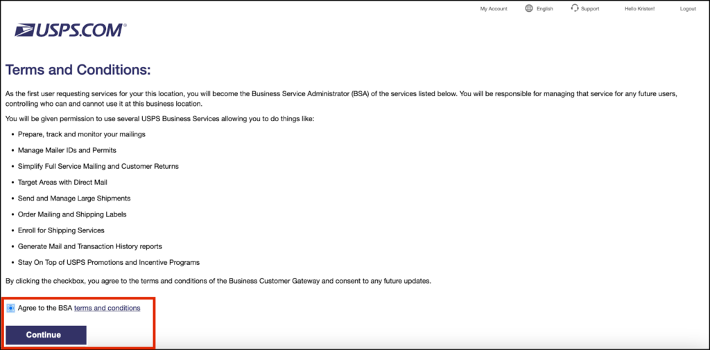 Once connected, manage your account directly through the USPS Business Customer Gateway.