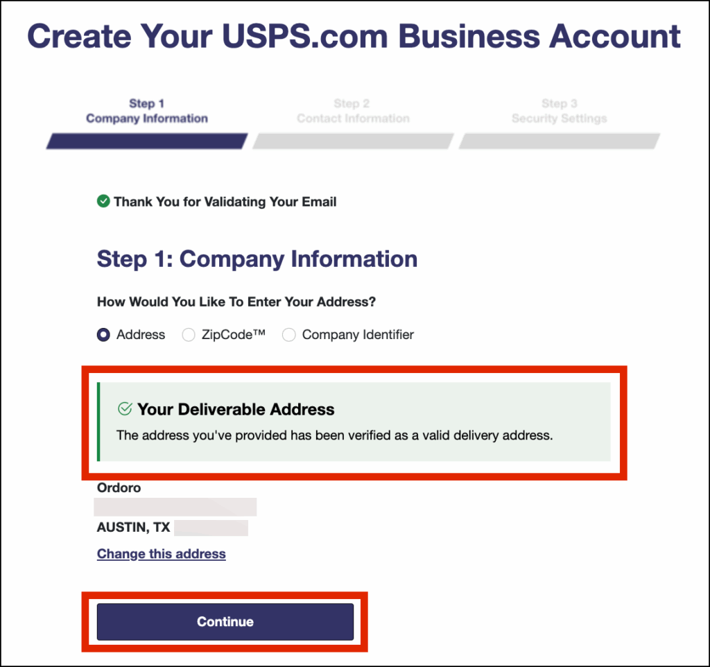- When the address is confirmed, click Continue.