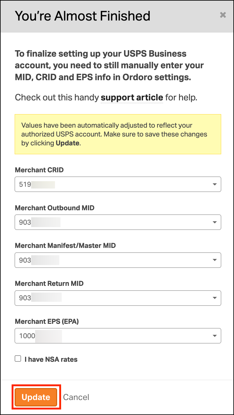 Reminder: USPS handles all billing directly. Ordoro does not store or manage USPS payment info.
