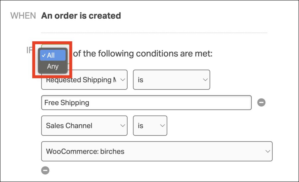 When you choose an IF field, Ordoro shows condition options that match that field type (text, dropdown, or number). Some fields also include Any / Every because an order can contain multiple line items.