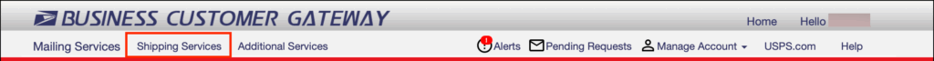 1. Log into your USPS Business Gateway account. At the top, go to Shipping Services.