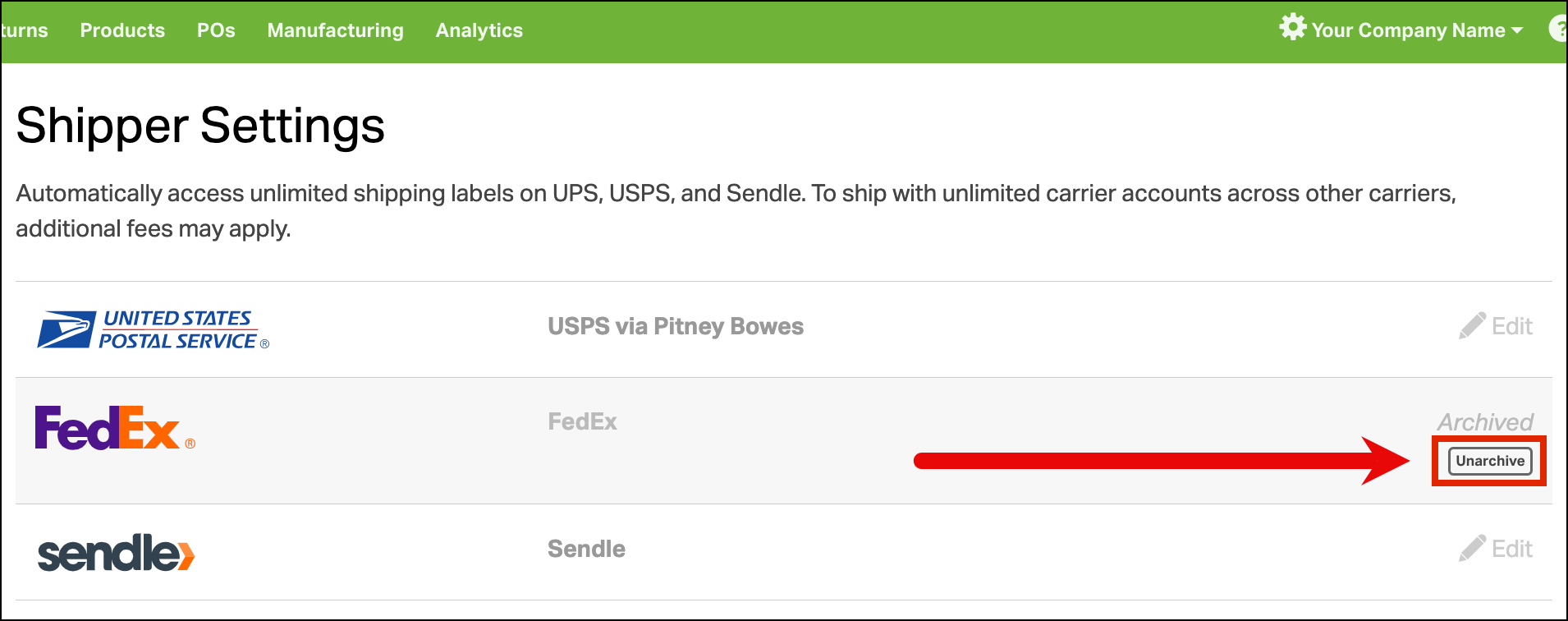- You can unarchive a non-USPS carrier at any time from the same Shippers page. Hover your mouse underneath Archived, and click the button to Unarchive.