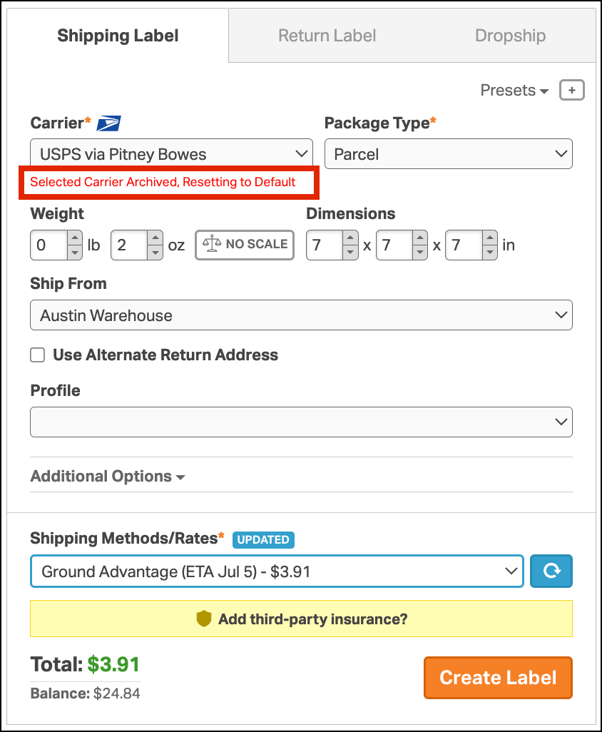 - Automation rules and shipping presets with carrier-specific actions for an archived carrier will no longer load rates. The action will fail with the following message: “Selected Carrier Archived. Resetting to Default.”